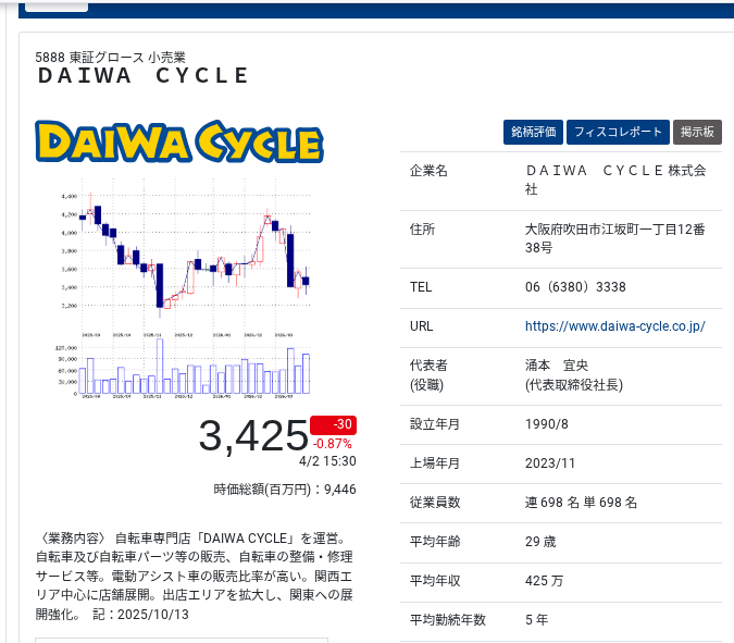 DAIWA CYCLE(5888) 目標株価4200円 買い推奨